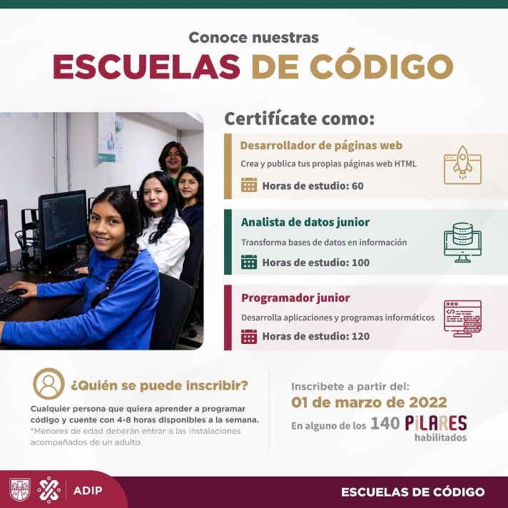 La inscripción, el curso y todos los materiales educativos que se te proporcionen no tienen ningún costo. Si eres menor de edad, deberás estar acompañado por un adulto durante tu estancia en las instalaciones.