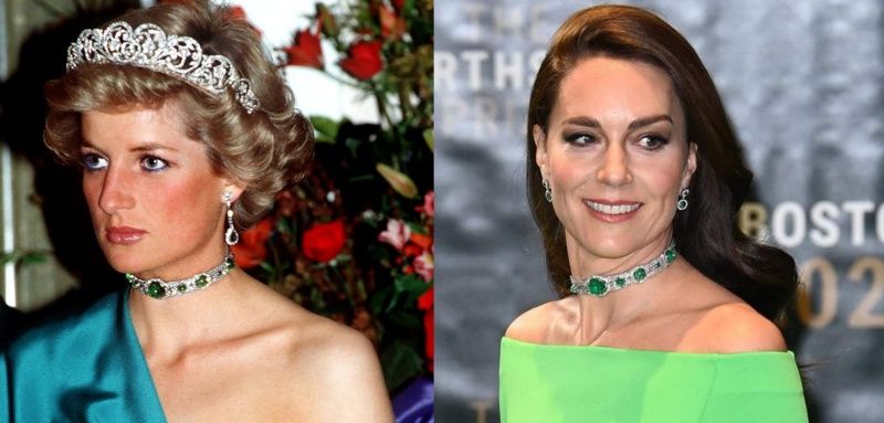 La actual princesa de Gales apareció con un fino vestido de Solace London en color verde, mismo que fue alquilado por $90 dólares (alrededor de $1,700 pesos mexicanos) en apoyo a la moda sostenible, además de la inolvidable gargantilla de esmeraldas y diamantes que Lady Di reconoció como una de sus favoritas antes de dejar este mundo, y que también perteneció a la reina Isabel II.